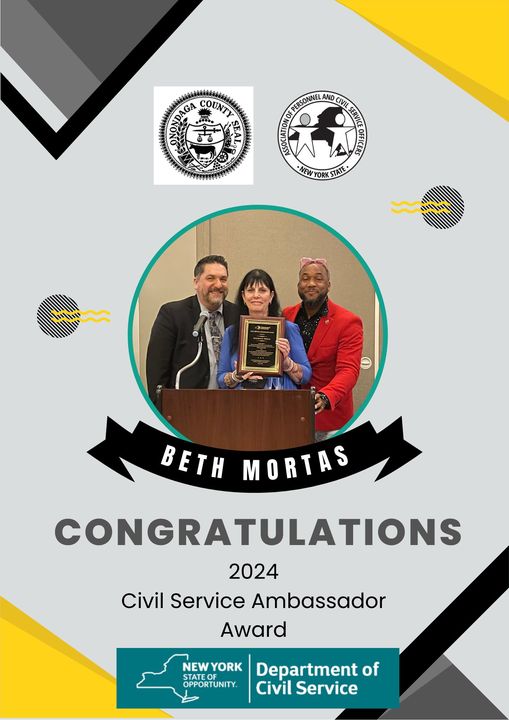 Beth started her civil service career with Cortland County in 2001. She eventually accepted an opportunity with Onondaga County in 2010 where she has remained ever since. Beth recently completed her term serving as the President for our Association from 2022 to 2024. Her commitment to the principles of Merit and Fitness and the effective and efficient administration of the merit system within her county gave her this recognition that is well deserved!